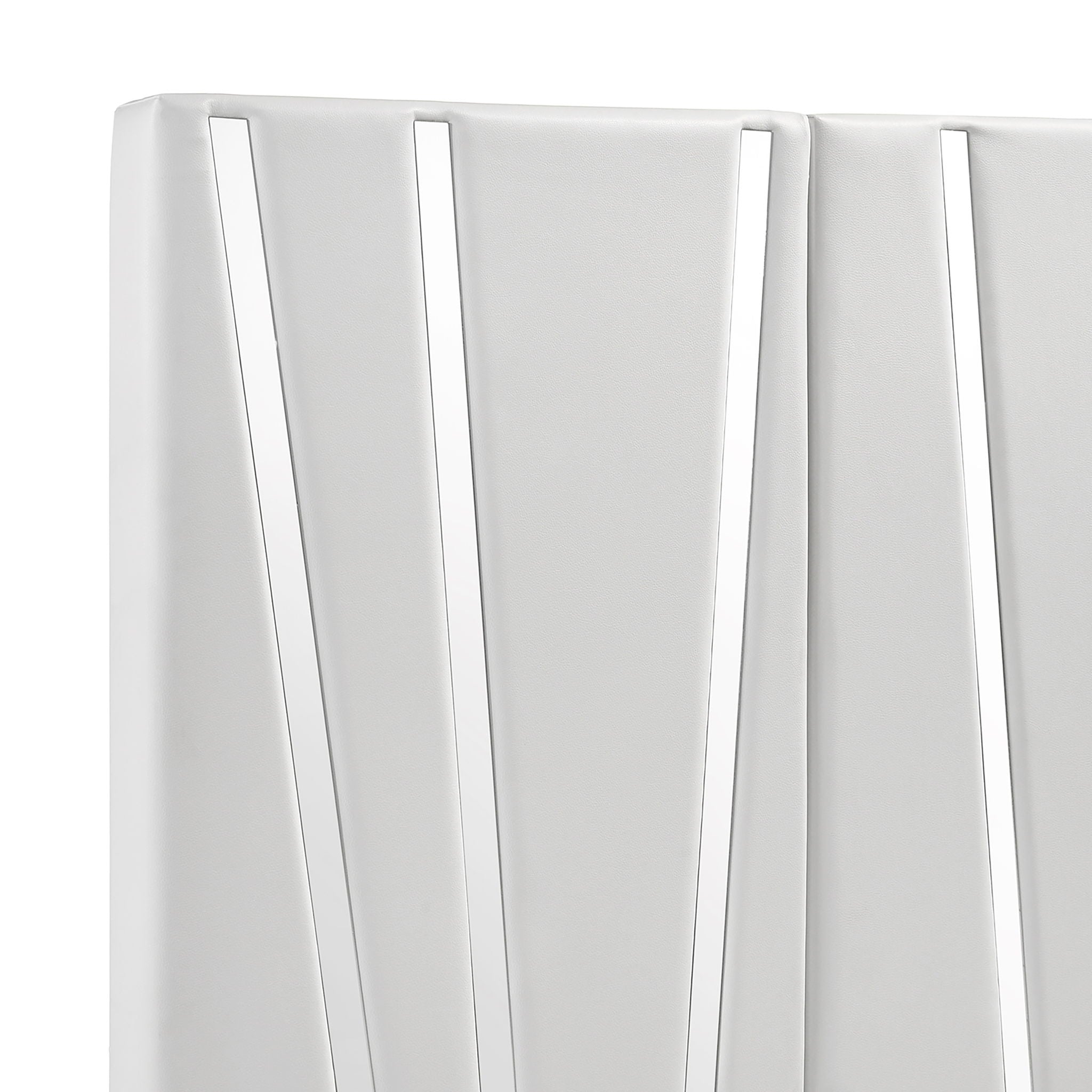 The Europa Panel Wall Bed offers a blend of modern elegance and practical design. This set includes a panel bed, two nightstands, and two nightstand back panels. The sleek, integrated headboard wall and nightstands creates a seamless and sophisticated look, enhanced by the white finish, mylar accents, and acrylic drawer pulls. Built with quality craftsmanship, the eco-friendly manufactured woods ensure durability, while the surfaces are finished with a glossy white topcoat and padded upholstery for added comfort. The bed features upscale extras like soft blue base lighting that reflects off the silver mylar bases, casting an ambient glow. The sturdy drawers, constructed with dovetail joinery and ball bearing glides, provide durable, easy-glide storage with snag-free interiors. The 2-drawer nightstands offer ample storage for bedside essentials. Choose the Europa Panel Wall Bed for a luxurious and contemporary addition to your bedroom.