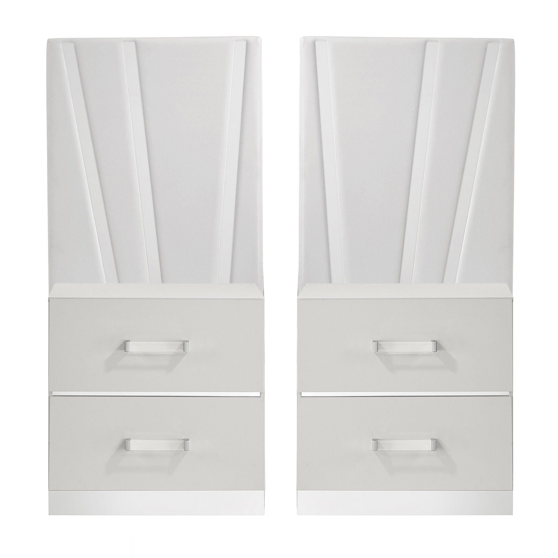 The Europa decorative back panels are designed for use with the Europa Nightstand. The Europa's sophisticated look is achieved through a gleaming white finish, mylar accents, and acrylic drawer pulls. Quality craftsmanship is evident in the eco-friendly manufactured woods, assembled for durability, with surfaces finished in a glossy white topcoat and padded upholstery. Upscale extras include silver mylar pedestal bases and decorative panel accents, enhancing the glamour of these nightstands. The sturdy, well-constructed drawers feature dovetail joinery and ball bearing glides for a durable, easy-glide operation, with interiors finished for snag-free storage. The two-drawer nightstands offer ample storage for bedside essentials. Choose the Europa Nightstands to add a touch of modern luxury and practicality to your bedroom.
