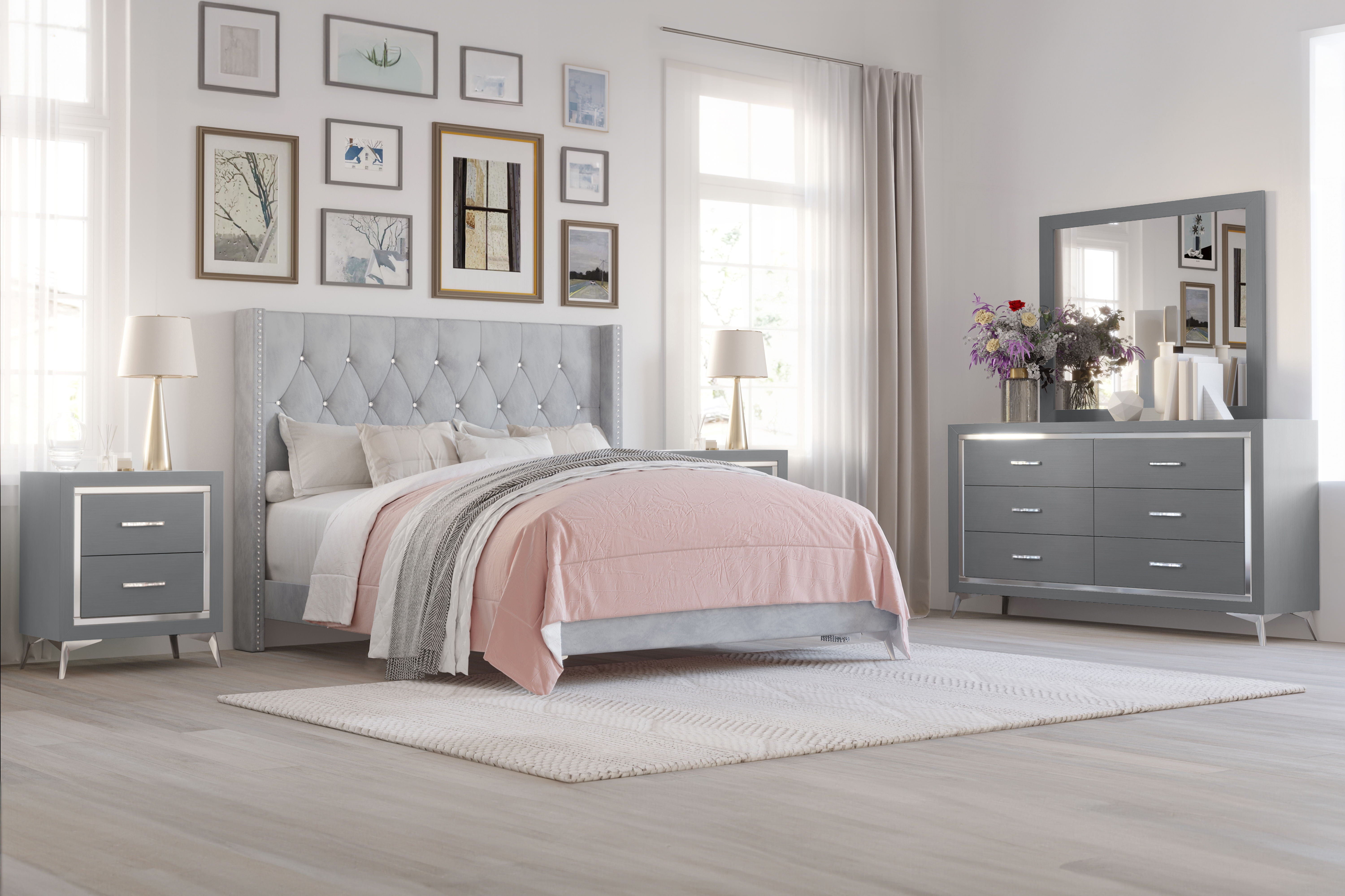 The Huxley Bedroom Set is a perfect blend of contemporary glam and durable construction. Each piece is crafted from manufactured woods and eco-friendly decorative laminate for long-lasting use. The bed features a crystal button-tufted headboard with silver studded trim, offering a touch of luxury and comfort, while the rich finish provides a sleek and sophisticated look that is both timeless and modern. The bold highlights the metallic accents and smooth surfaces, creating a chic and polished aesthetic. The drawers are designed with quality in mind, rolling smoothly on center glides and constructed with English dovetail joinery for durability. The dresser and chest offer ample storage with chic, crystal-studded drawer pulls for easy access. Invest in the Huxley Bedroom Set for a functional and fashionable addition to your home.