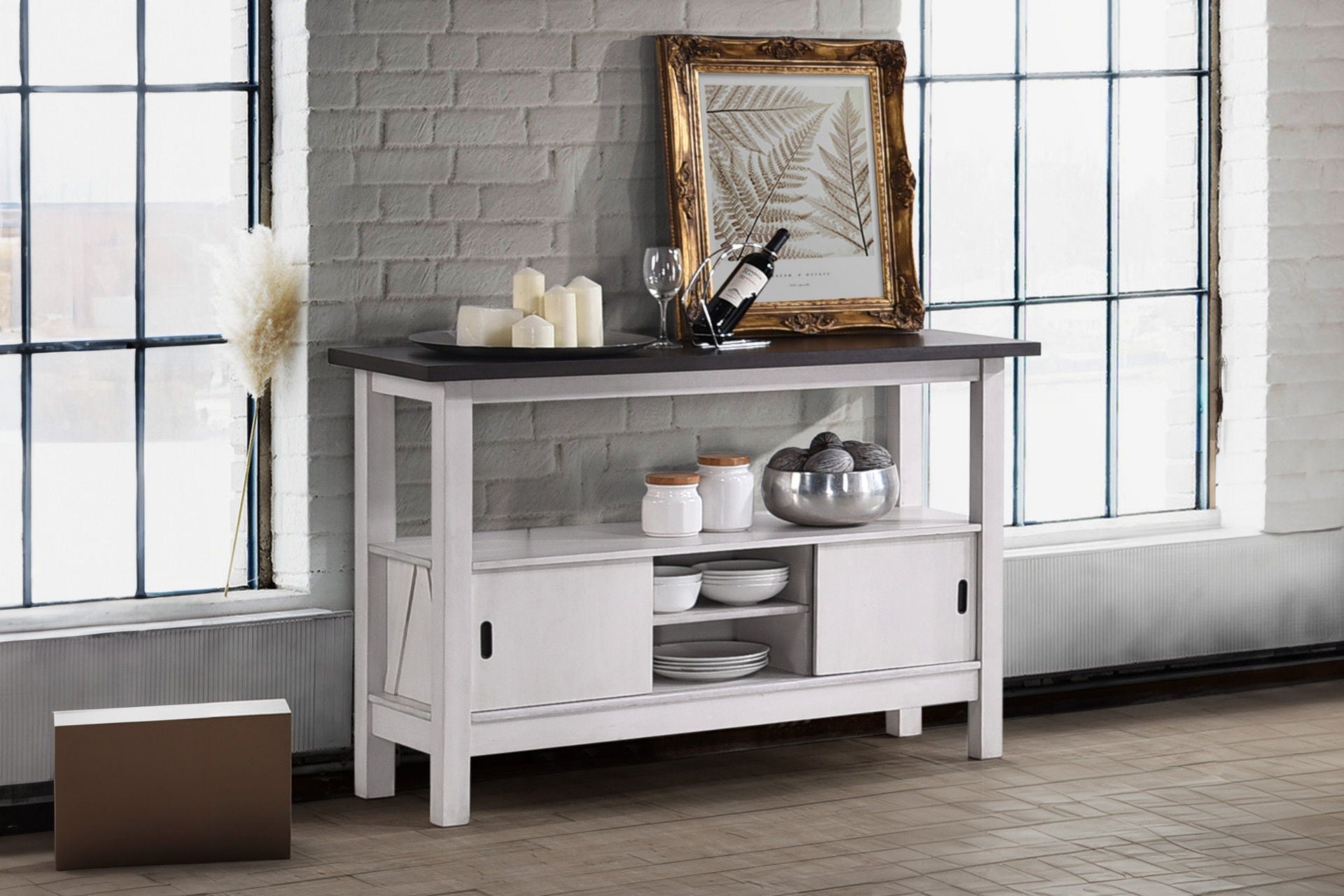 - Rustic, Farmhouse Finish: The Server has a dark brown top with a smooth finish, providing a modern contrast to the rustic design. The cabinet base is painted white and slightly distressed, enhancing the farmhouse appeal and adding character.