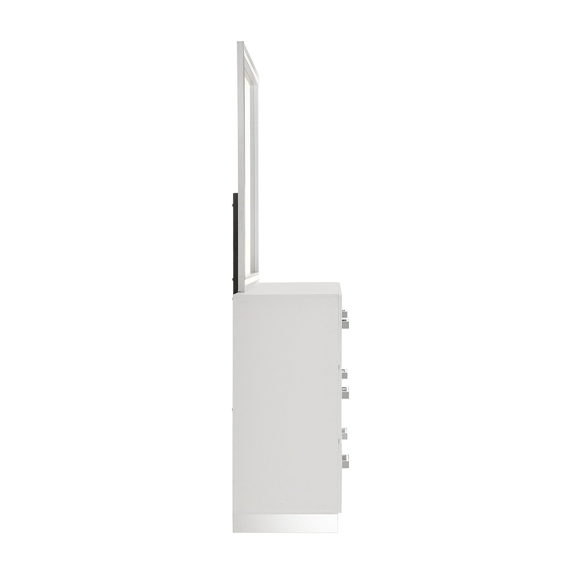 The Europa Mirror in white is a perfect blend of modern design and quality craftsmanship. This mirror features a sleek, sophisticated look with a bright white finish that adds to its glimmering appeal. Made from eco-friendly manufactured woods, it is assembled with durability in mind, and the surfaces are finished with a glossy white topcoat. The upscale design includes a low-distortion mirror encased in a tapered frame, adding a modern flair to any room. Choose the Europa Mirror to enhance your space with a touch of contemporary elegance and high-quality construction.