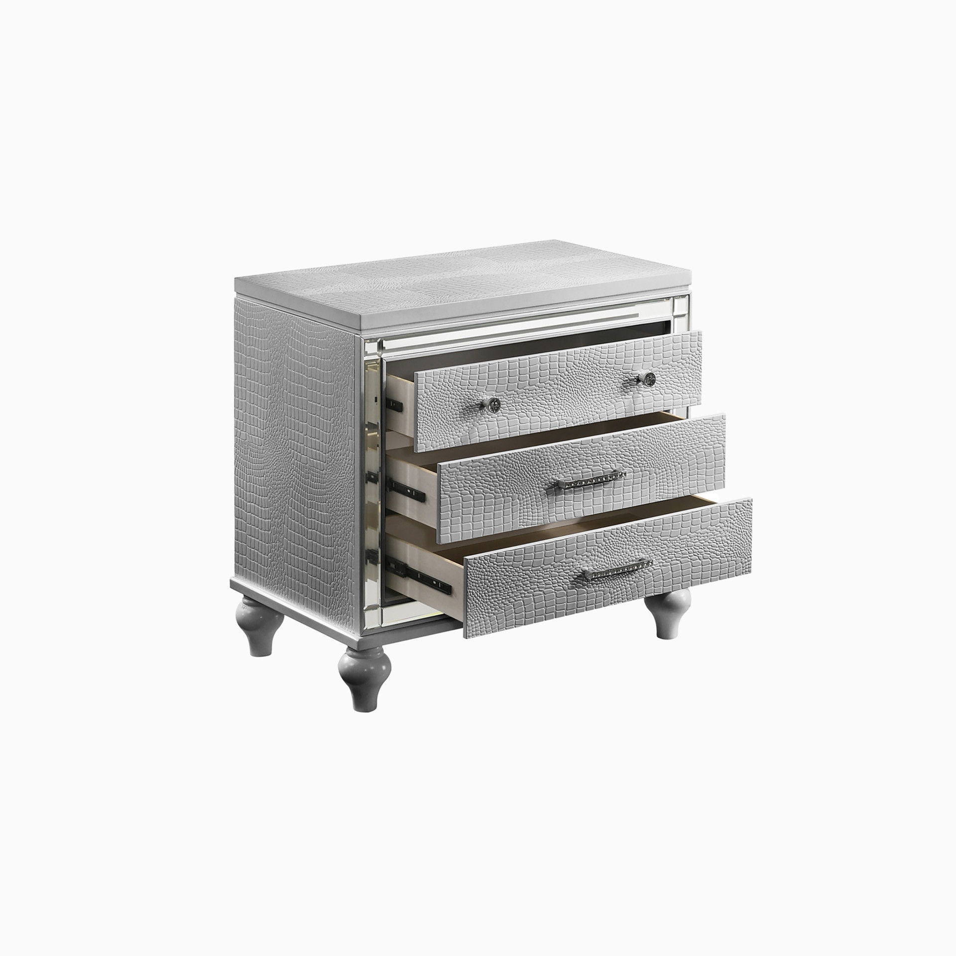 The Valentino 3 Drawer Nightstand is a luxurious addition to any bedroom. Crafted from a blend of manufactured and solid woods, it is built to last while maintaining its distinctive appeal. Its glamorous design includes a gleaming finish, mirrored trims, crystal-studded drawer pulls, and alligator-embossed inlays, embodying the essence of Hollywood glamour. In addition to its stylish appearance, this nightstand offers practicality with its thoughtful details. The heirloom-crafted English dovetailed drawers boast finished interiors to prevent snags and roll smoothly on full-extension ball-bearing glides, ensuring easy access to your belongings. This nightstand provides an abundance of storage with its three spacious drawers, making it perfect for keeping bedside essentials organized and within reach. With its combination of durability, elegance, and functionality, the Valentino 3 Drawer Nightstand is a must-have piece for creating a glamorous bedroom retreat.