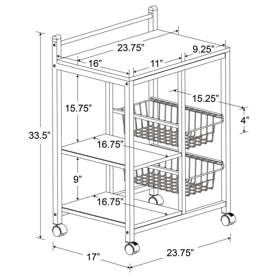 This versatile kitchen cart delivers functionality and charm with its natural brown top and white metal frame. A spacious surface provides room for appliances or meal prep, while dual-sided storage keeps essentials neatly organized. Two sturdy wood shelves accommodate dinnerware or pantry items, and two wire baskets hold fresh produce for easy access. Designed with smooth-rolling casters for effortless mobility, this compact cart offers convenient storage and a clean, modern look for any kitchen.