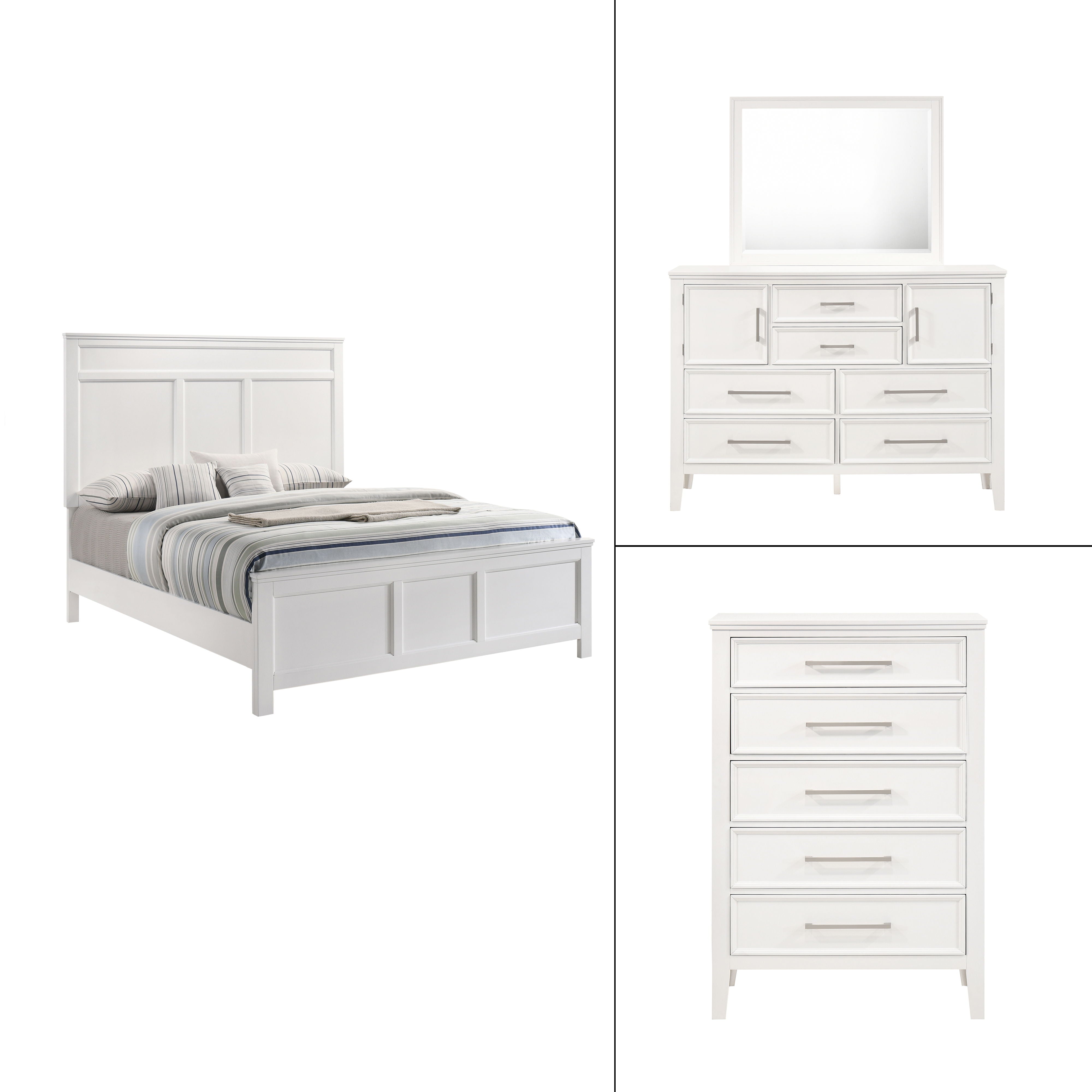 The Andover Wood Bedroom Set in offers a complete and elegant solution for your bedroom, combining durability, style, and functionality. This set all expertly crafted from solid Rubberwood, manufactured woods, and wood veneers, ensuring lasting durability while highlighting the natural beauty of real wood. The semi-gloss finish provides a crisp, versatile appeal that effortlessly complements a wide range of décor styles, whether modern or traditional, enhancing your space with a fresh and refined look. The Andover collection''s clean lines and understated contemporary design create a seamless and cohesive aesthetic. Sleek, elongated metallic handles add a touch of sophistication, standing out gracefully against the pristine finish, while framed drawer fronts offer visual depth and dimension. The sturdy block-style legs provide a solid foundation, reinforcing the collection''s robust and enduring construction. The drawers glide smoothly on robust Kenlin drawer glides, and the dovetail joinery inside reflects superior craftsmanship and enduring quality. This set combines timeless design with practical functionality, making it a stylish and reliable choice for any bedroom.
